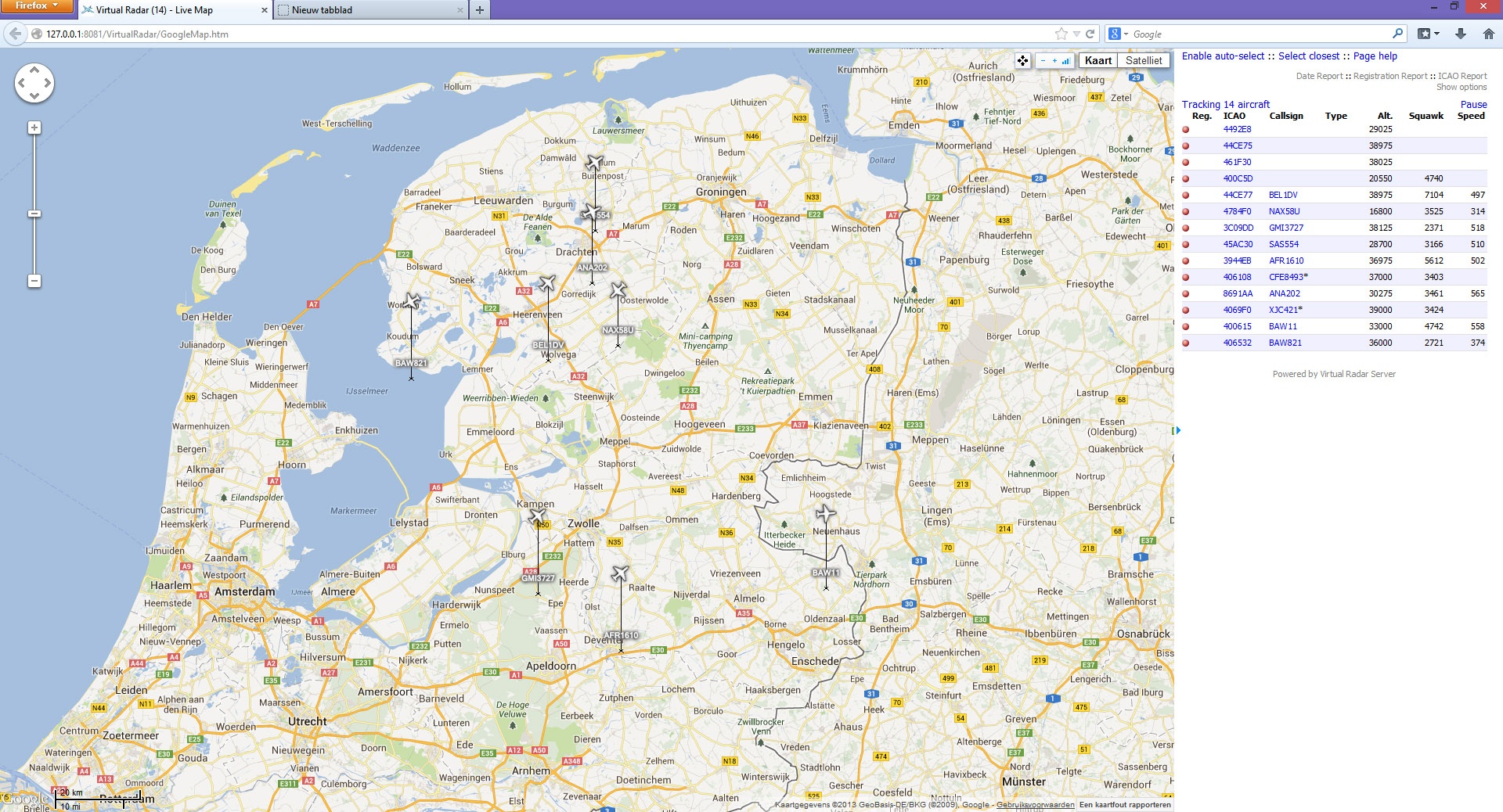 Nu het leuke stuk. Nu we al die berichtjes binnenkrijgen moeten we nog zorgen dat we ze kunnen weergeven. Hiertoe gebruiken we VirtualRadar. Deze tool start een webserver op een in te stellen poort, vangt de berichten van ADSB# af, en rendert de resultaten op een Google Maps kaart.
